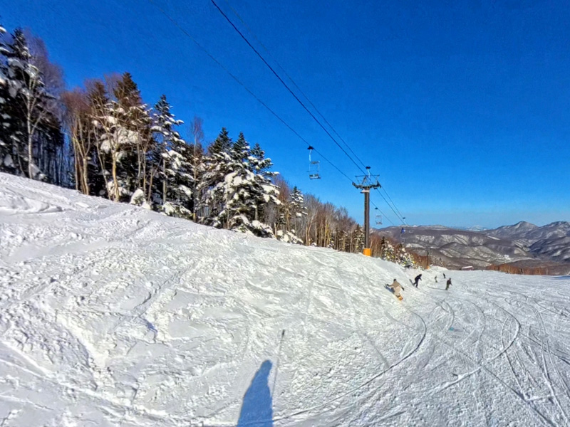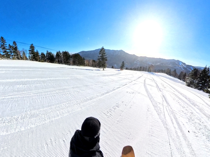1本目はきれいな圧雪バーンで、エッジがしっかりと噛み、気持ちよくカービングで滑り降りれました。