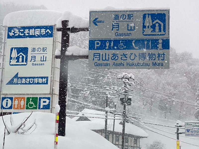 鶴岡の街の方は全然雪が降ってなかったのに、湯殿山のある月山方面に向かうとモサモサ降りはじめました。